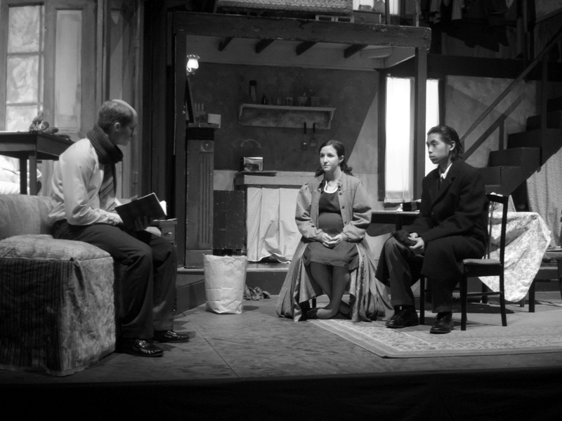 | Miep (Erin Adelman) and Mr. Kraler (Steven Kon) listen to Mr. Frank (Nick Pawson) read from Anne's Diary. |